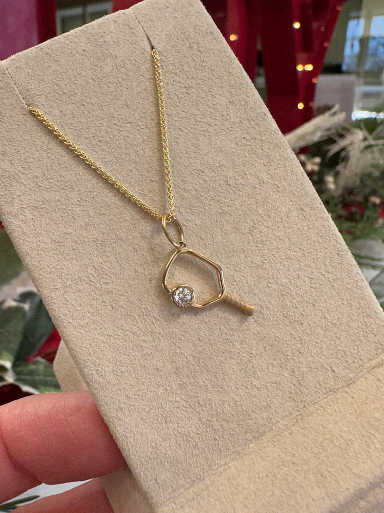 14kt yellow gold open pickleball pendant with a single round brilliant cut diamond 0.09ct sold with a 16" 14kt yellow gold 1.1mm rounded wheat chain.