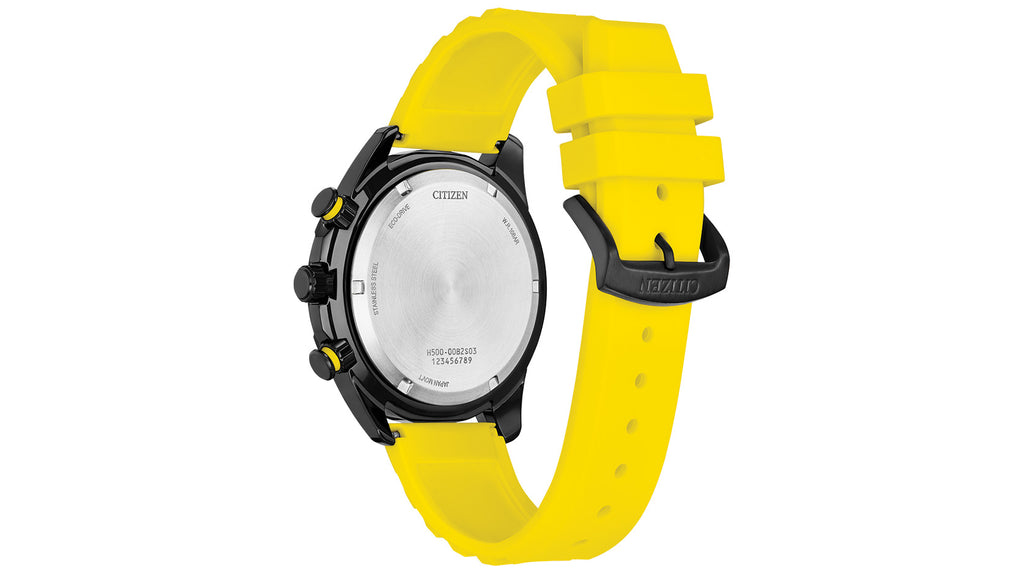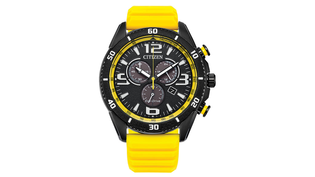 On the dial, the sporty styling continues, with lume-filled, highly legible hour markers anchoring the look, while a yellow tachymetric scale outlines the display. Advanced functions include a 1-second chronograph measuring up to 60 minutes, 12/24 hour time, and a date indicator at the 4 o'clock position. The men’s high-performance Brycen is sustainably powered by any light with Citizen's proprietary Eco-Drive technology that never needs a battery. Water resistant up to 100 meters. Caliber H500.