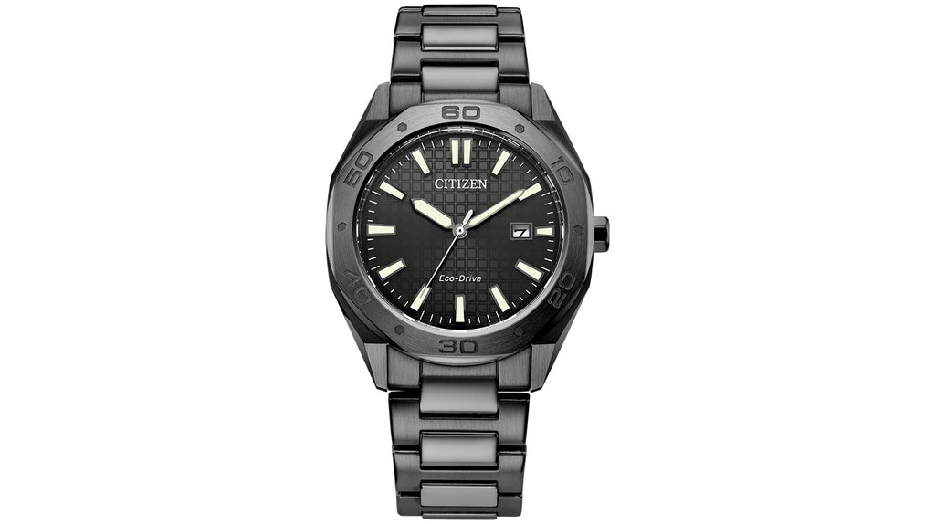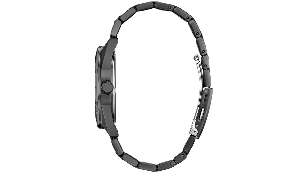 On the dial, a textured gray display is presented, with applied indices in bright white alongside a 3 o'clock date window providing high legibility and daily utility. Featuring Citizen's Eco-Drive technology, sustainably powered by any light and never needs a battery. Caliber number E111.