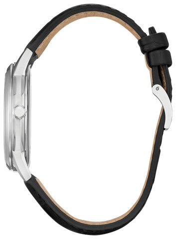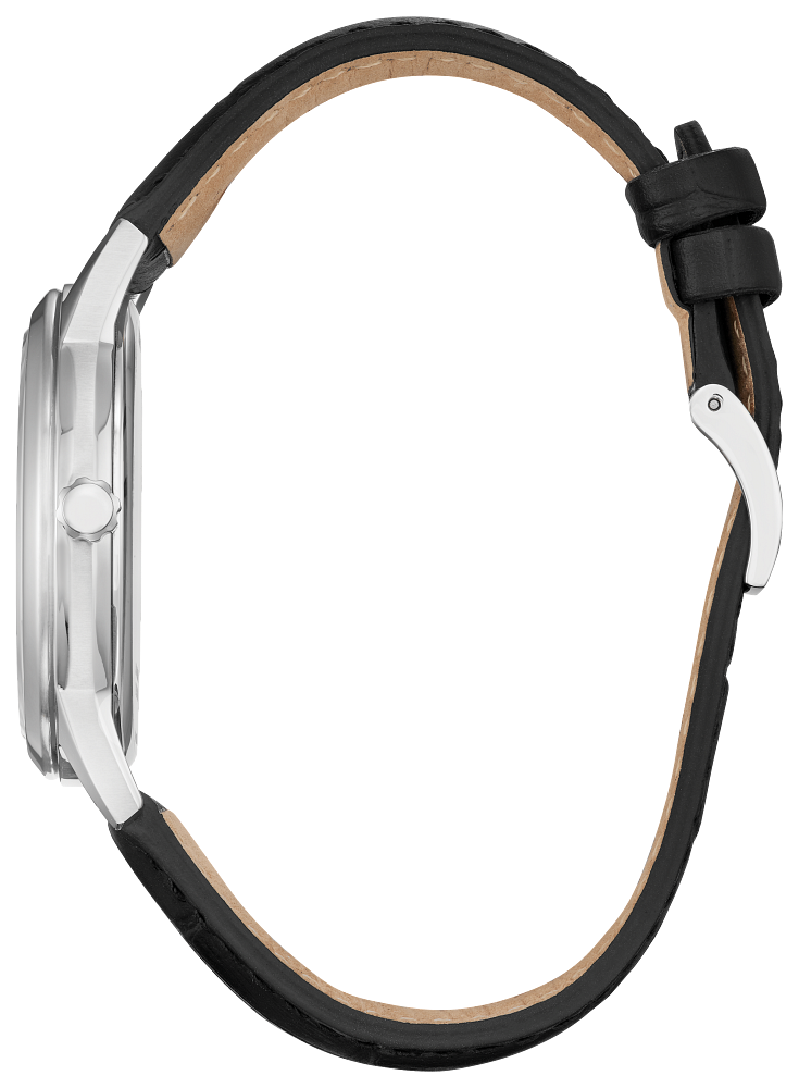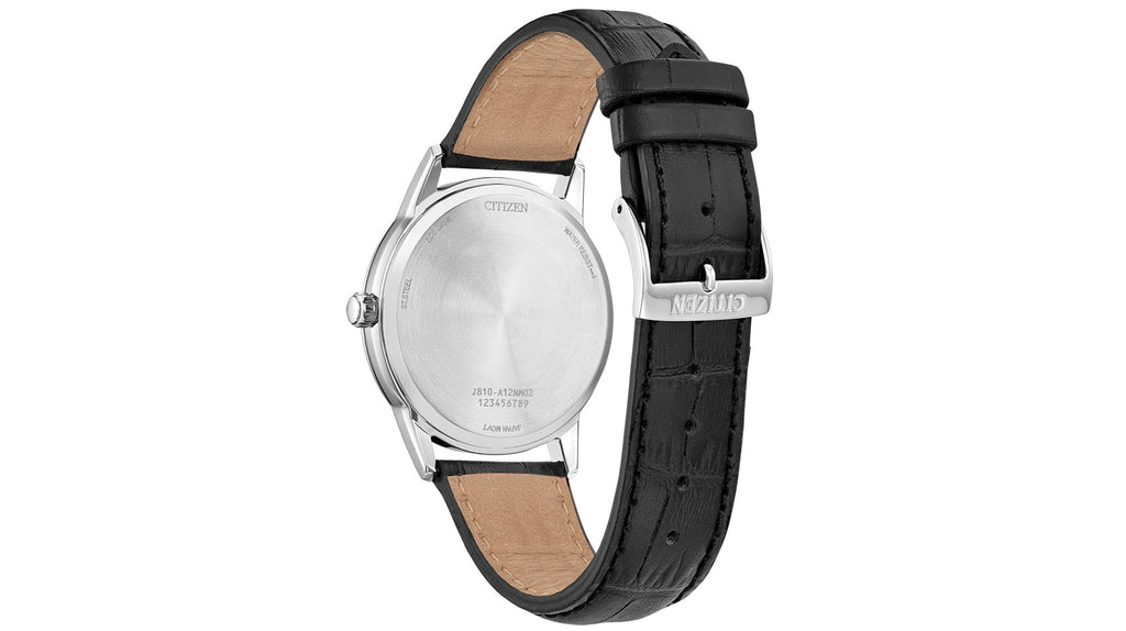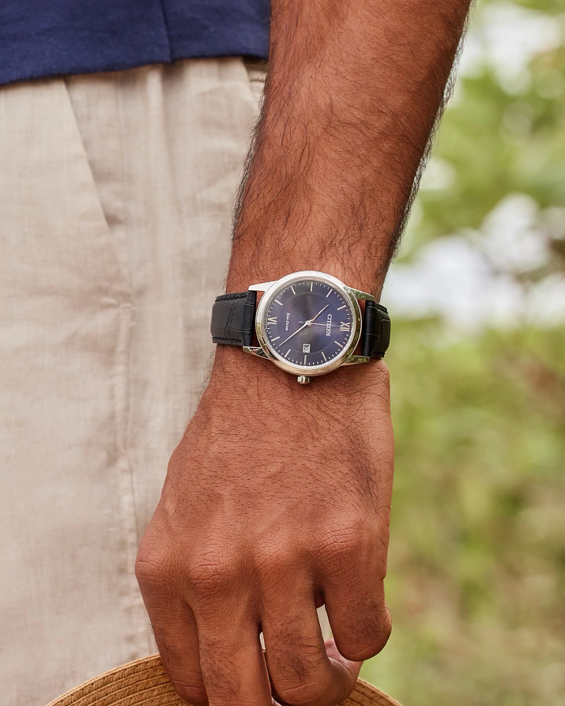 Classic lines and a simple silhouette define the newest addition to the Classic collection. This vintage-inspired timepiece features a silver-tone stainless steel case, a striking blue 3-hand dial with a date function, and a rich black leather strap with buckle closure. Sustainably powered by any light with Eco-Drive technology and never needs a battery.