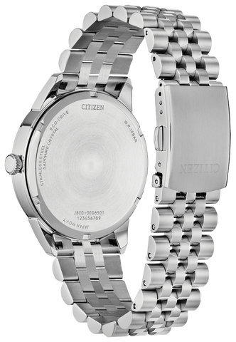 The watch features Citizen's Eco-Drive technology – sustainably powered by light, any light, and never needs a battery. Water resistant to 100 meters. Caliber J800.