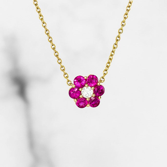 Beautiful in its simplicity, this magnolia ruby and diamond necklace is sure to add some color to your life. 6 rubies total 1.20ct and diamonds total 0.12ct. 14kt yellow gold adjustable 16-18" chain finished with a lobster clasp.