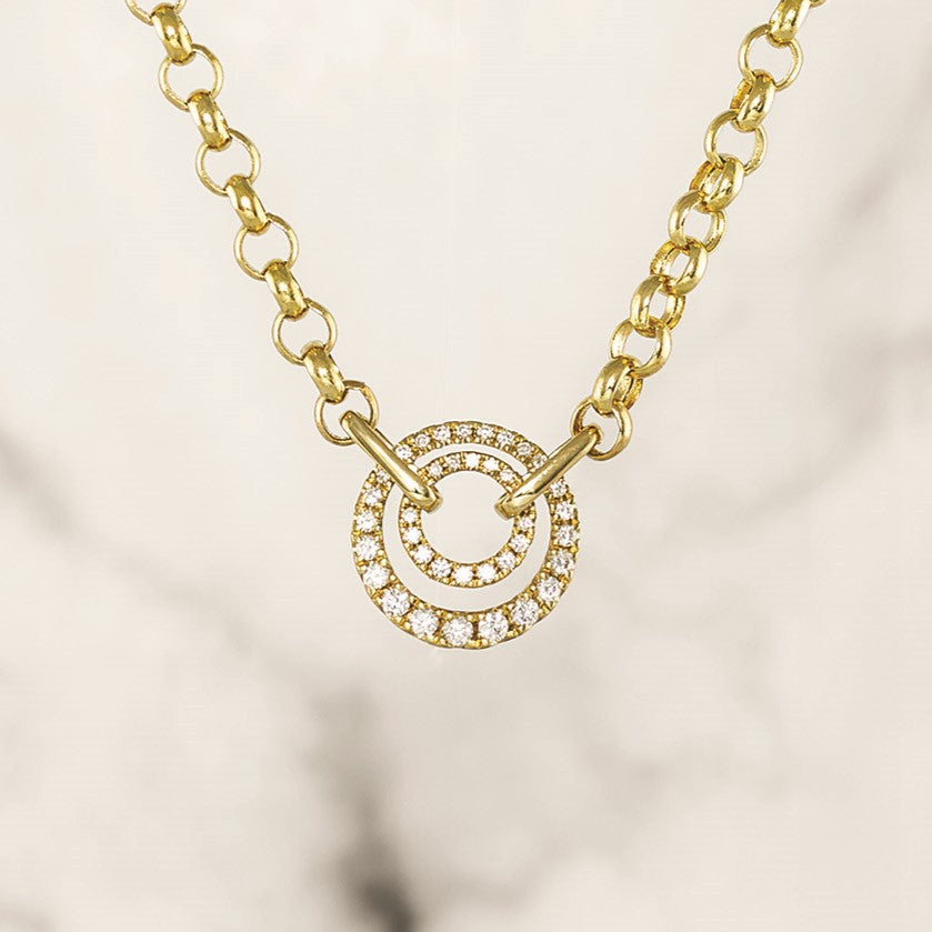 Double circle pendant with rolo chain, diamonds in pendant total 0.32ct, 14kt gold