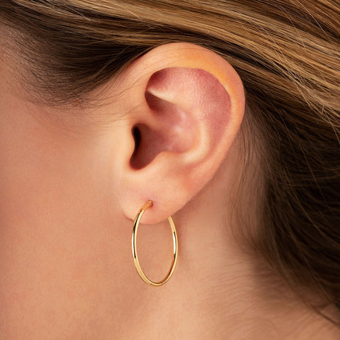 14kt gold thin (1.5mm wide) tube hoop. Available in 14kt yellow, white, or rose gold (special order 1-3 weeks). Made in the USA.