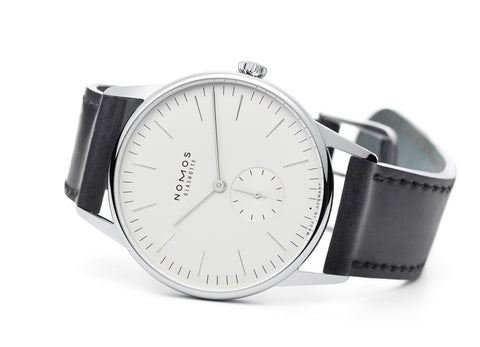 More Orion: With a 38-millimeter diameter this timepiece deserves its place among the larger models from NOMOS. Yet, with the curved dial and sapphire crystal glass, it still feels particularly slender and elegant. Also big league: the tempered blue hands on the white silver-plated dial face. Behind it, the hand-wound caliber Alpha is at work—reliably and with the highest precision.
