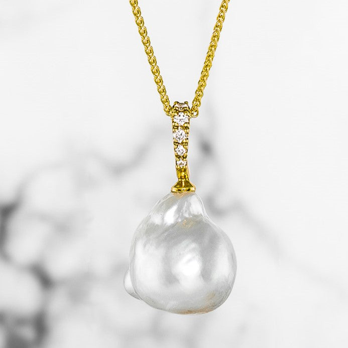 Baroque pearl pendant with diamonds in bail totaling 0.17ct. 18kt yellow gold. Chain sold separately.