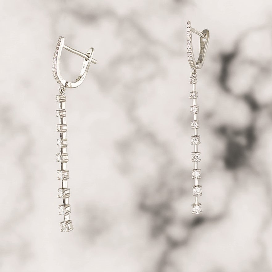 These 14k white gold diamond earrings feature 0.54 total carats (40 round diamonds) mounted in a graduated straight line on diamond huggie-style hoops. They measure approximately 1.75 inches in length