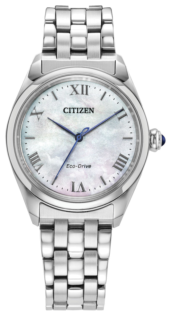 Refined yet subtly sporty, the watch features a 33mm silver-tone stainless steel case paired with a matching five-link bracelet. Faceted lugs and a synthetic sapphire-set crown lend an elevated touch to the design. Beneath a curved dual-sphere sapphire crystal, the natural radiance of the mother-of-pearl dial is complemented by silver-tone Roman numeral indices and matching hands for a cohesive, graceful display. Whether worn as a dress watch for special occasions or as a sophisticated daily companion, the Citizen L Classic offers timeless appeal for every wrist and every moment. Water resistant up to 100 meters. Caliber E031.
