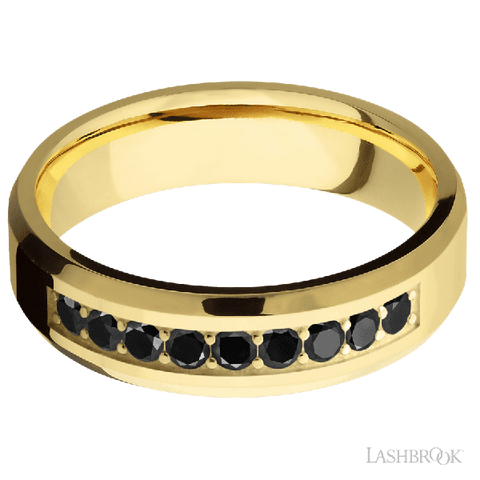 14KY6BBLKDIA9X.05BEAD-P 6 mm wide/Beveled/14K Yellow Gold band with an arrangement of 9, .05 carat Round Black Diamond stones in a Bead Channel setting.