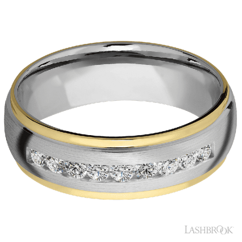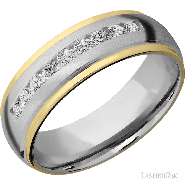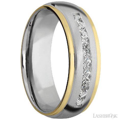 7 mm wide/Domed Stepped Down Edges/Cobalt Chrome band with an arrangement of 9, .05 carat Round Lab Grown Diamond stones in a Channel setting and featuring two 1 mm Edge inlays of 14K Yellow Gold