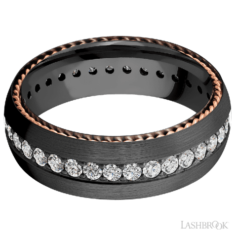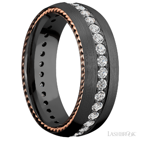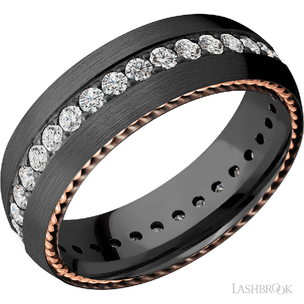 7 mm wide/Domed/Zirconium band with two 1 mm Sidebraid inlays of 14K Rose Gold and featuring an Eternity arrangement of .03 carat Round Lab Grown Diamond stones in a Bead setting