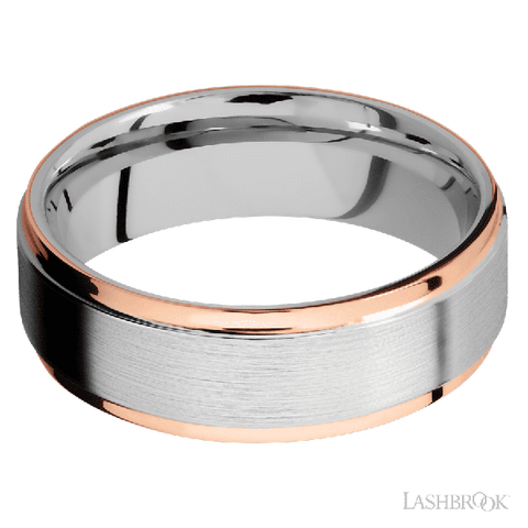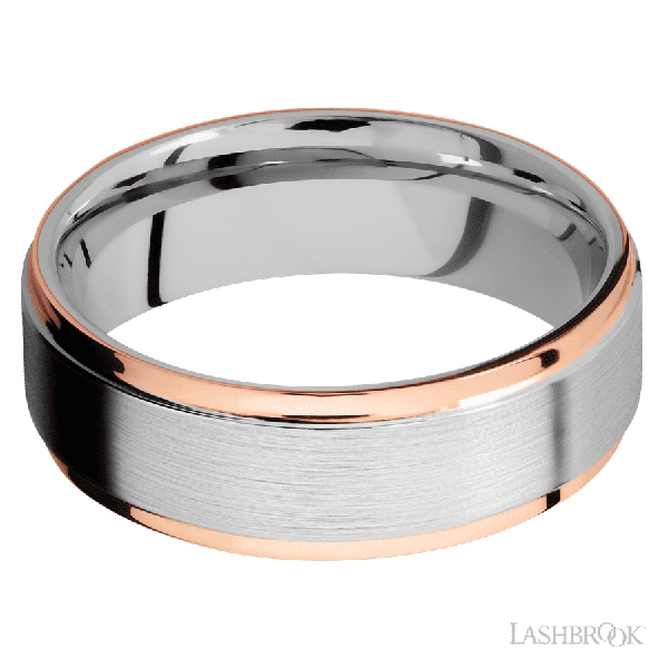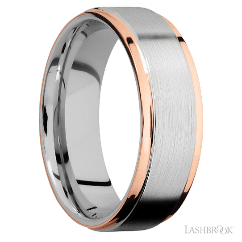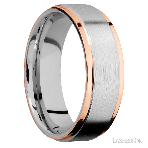 7 mm wide/Flat Grooved Edges/Cobalt Chrome band with two 1 mm Edge inlays of 14K Rose Gold.
