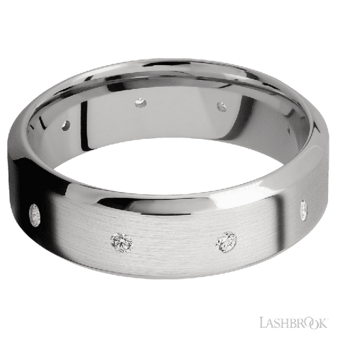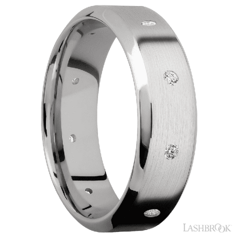 7 mm wide/High Bevel/14K White Gold band with a 9X Even arrangement of .03 carat Round Diamond stones in a Flush setting.