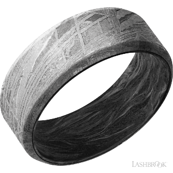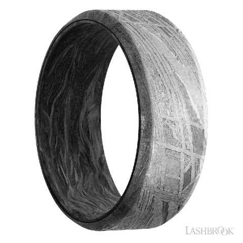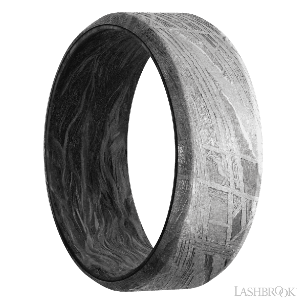 8 mm wide Beveled Meteorite band featuring a Forged Carbon Fiber sleeve.