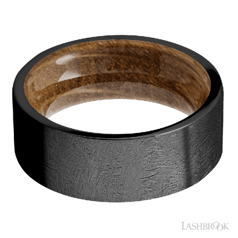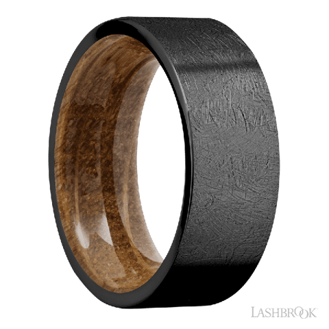 8 mm wide Flat Zirconium band featuring a Whiskey Barrel sleeve.